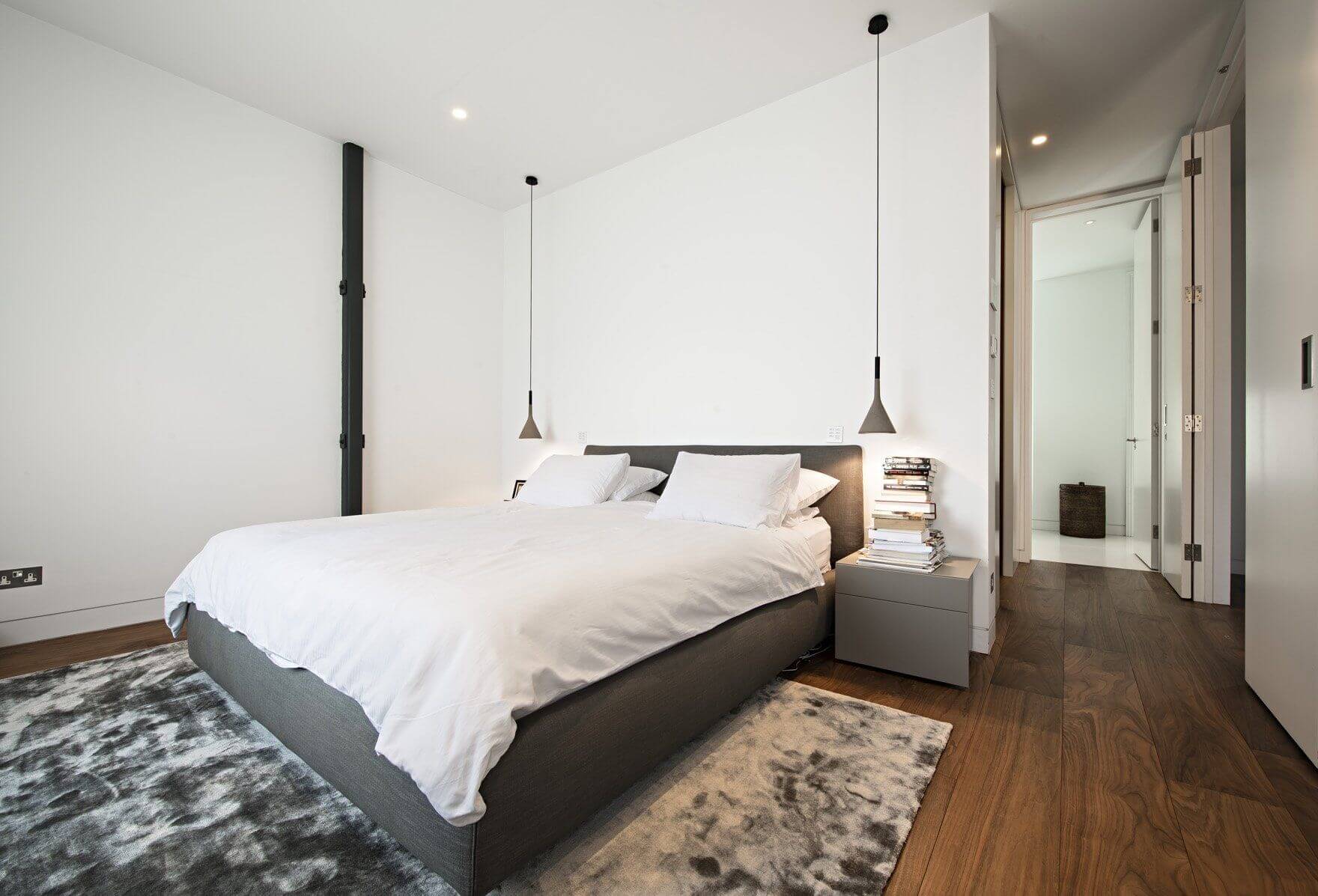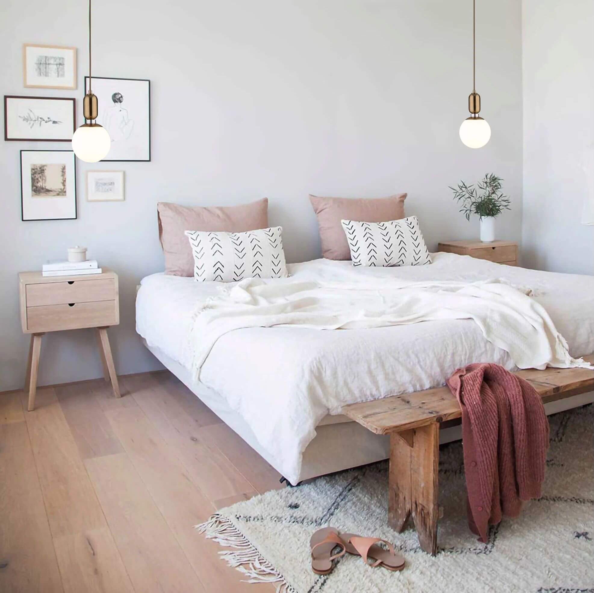 Откажитесь от классических настенных бра в пользу подвесных светильников по обе стороны кровати. Такое решение смотрится более современно и добавляет интерьеру легкости. К тому же высоту светильников можно регулировать под себя, создавая максимально комфортное освещение для чтения.
