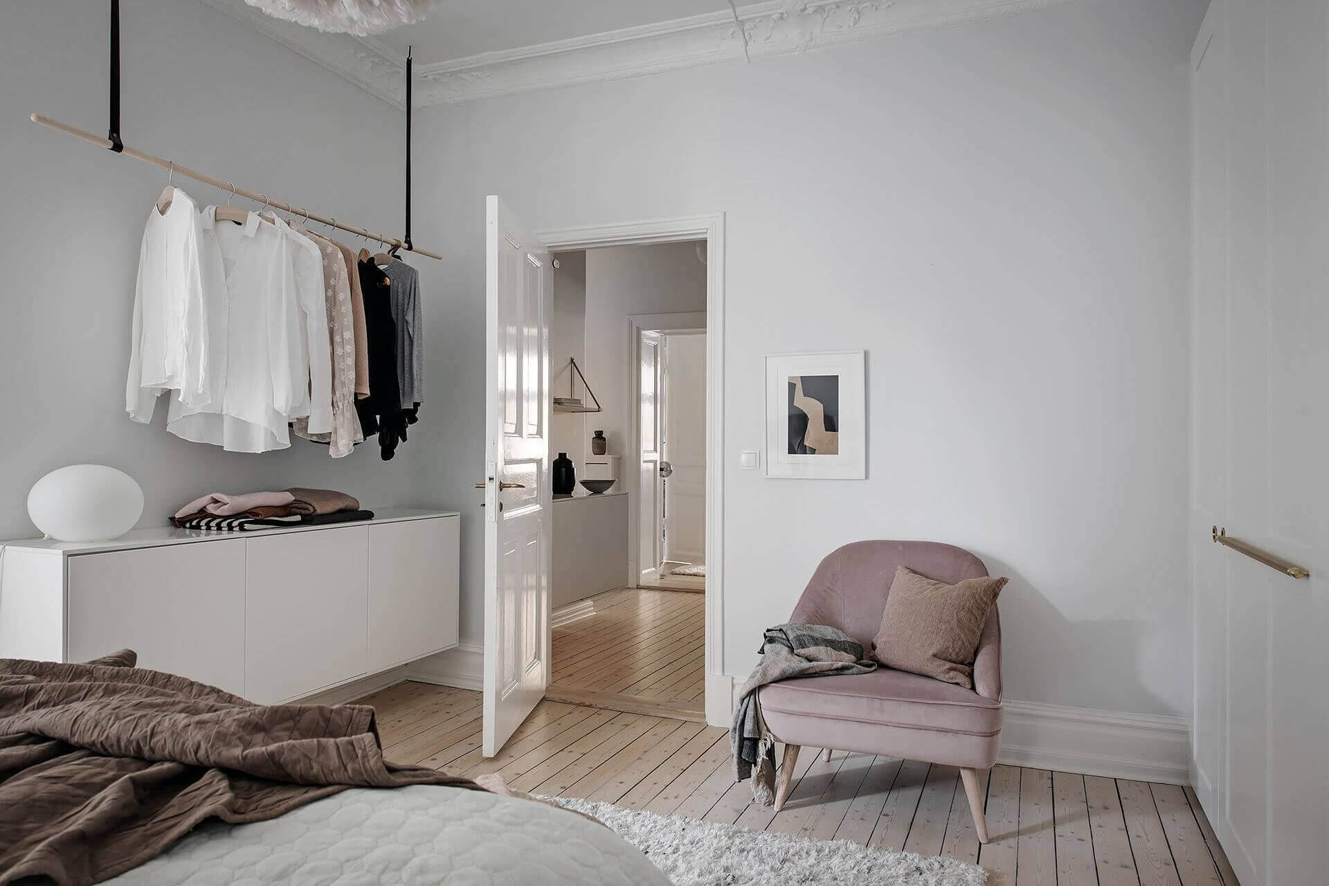 Если нет места для полноценного шкафа, можно организовать открытую систему хранения: подвесные вешалки, навесные полки, рейлы и крючки для одежды. Такая мини-гардеробная выглядит воздушно и стильно, особенно если все выдержано в одной цветовой гамме.
