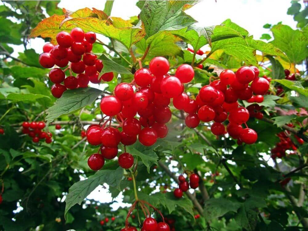 Калина — не только декоративный, но и полезный кустарник. В высоту может достигать 3–4 метров. Весной она радует крупными белыми соцветиями, летом — насыщенными зелеными листьями, а осенью — ярко-красными ягодами и пылающей листвой. Калина хорошо переносит морозы и любит влажную почву, поэтому отлично подходит для посадки возле водоёмов или в низинах участка. Это растение придаёт саду естественный и живой вид.
