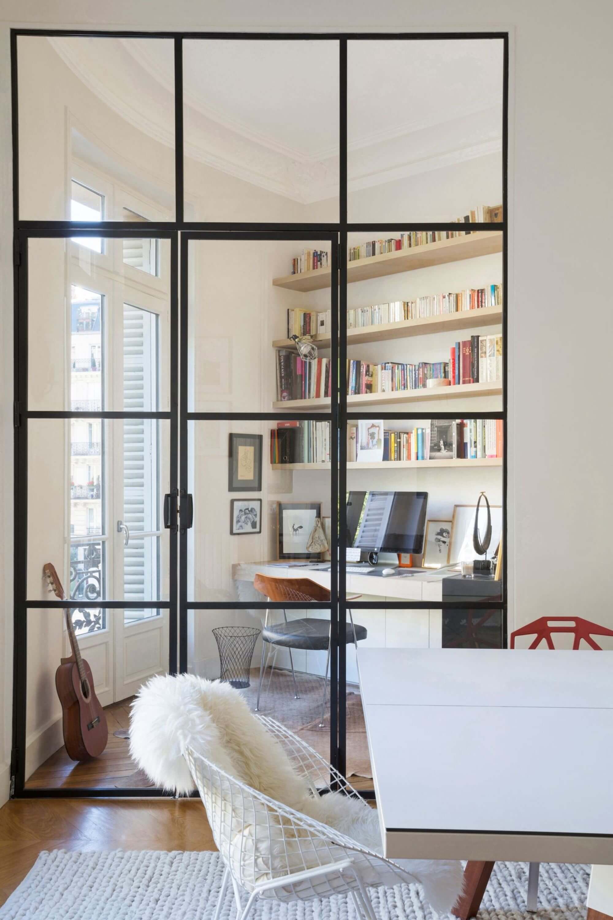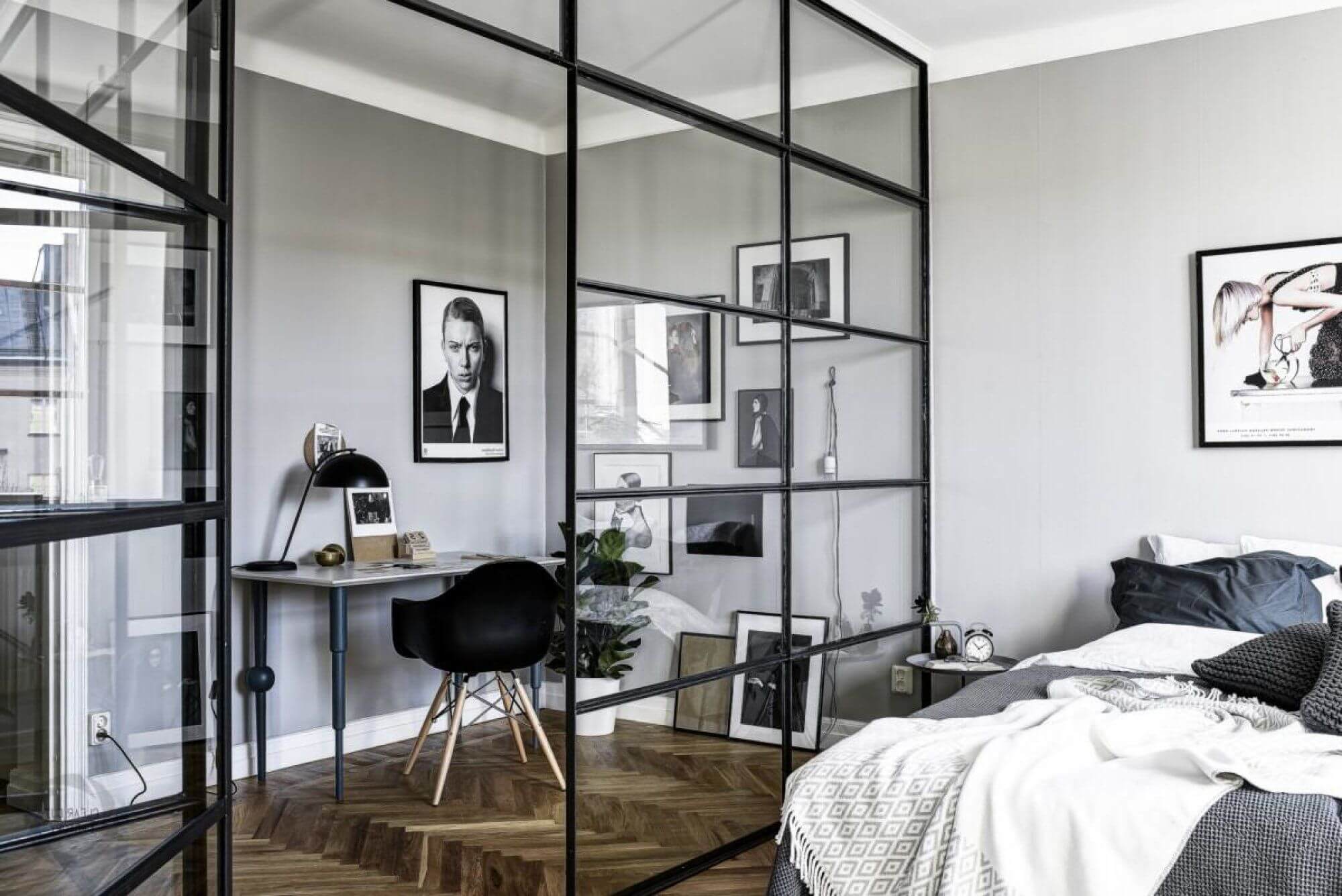 Если у вас нет отдельной комнаты под кабинет, используйте высокий стеллаж, ширму или стеклянную перегородку, чтобы отделить рабочую зону от жилого пространства. Такая обстановка будет максимально настраивать на рабочий лад.