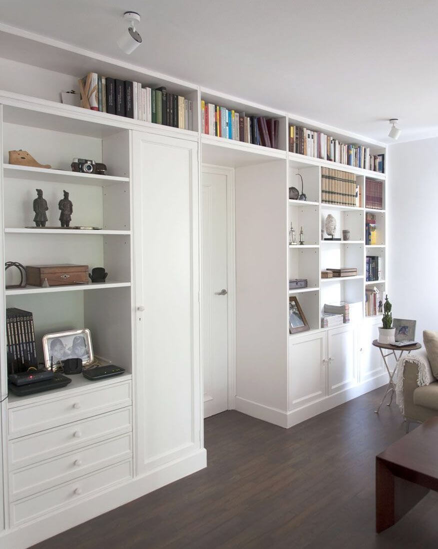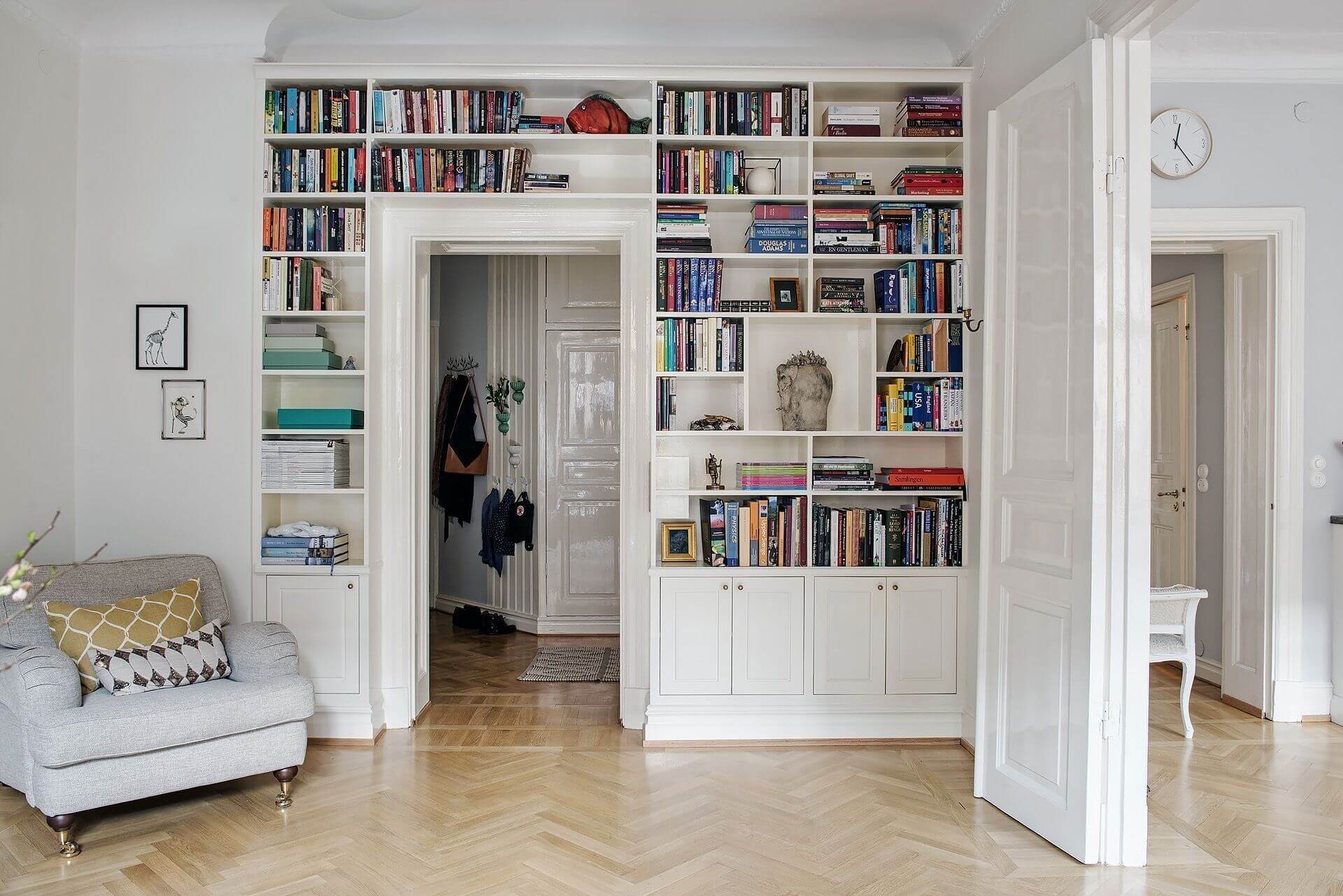 Обратите внимание на полезное пространство вокруг дверного проема, которое обычно остается пустым и незадействованным. Туда идеально встанет шкаф с открытыми полками для книг, техники, декора и различных аксессуаров.
