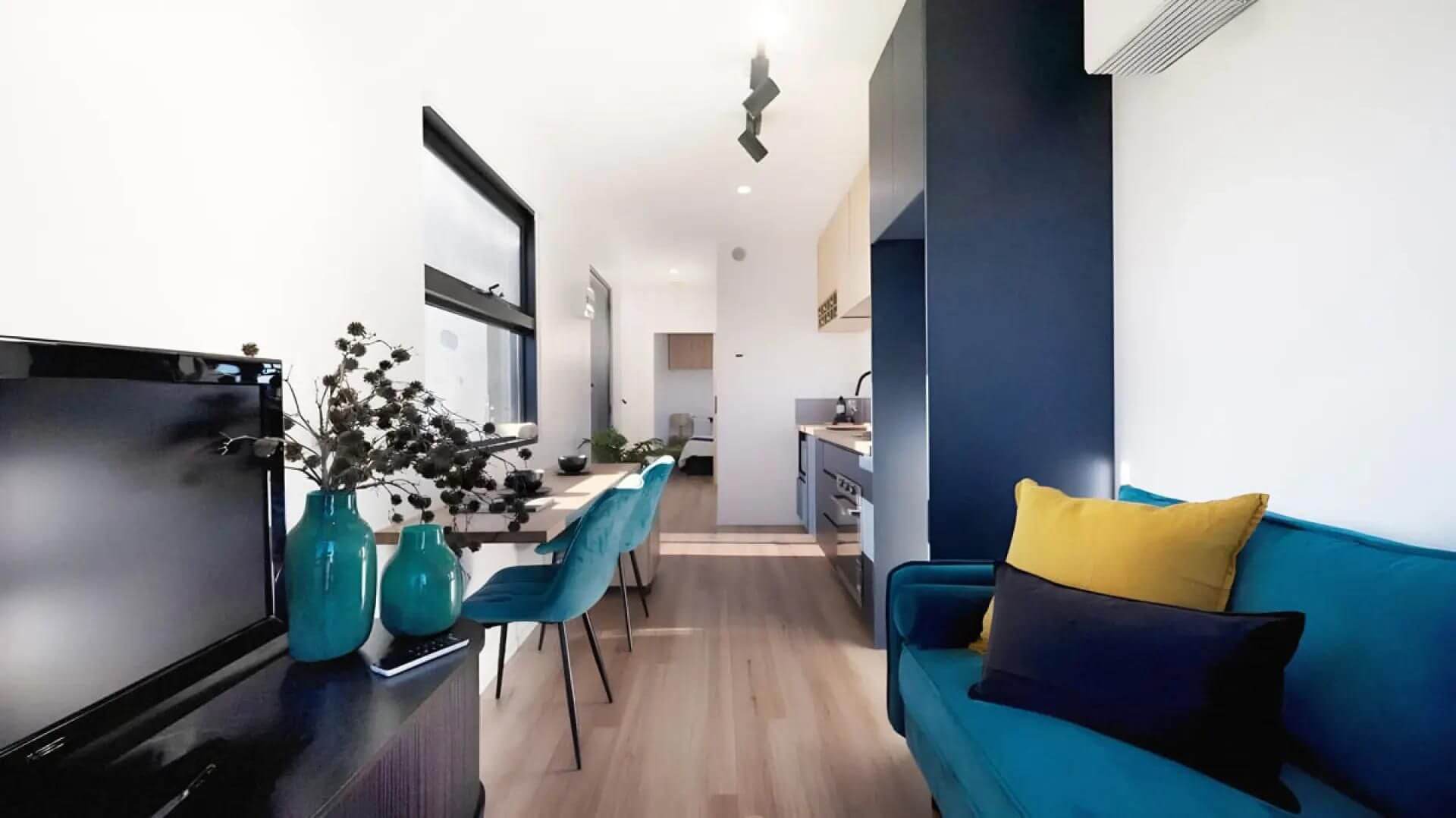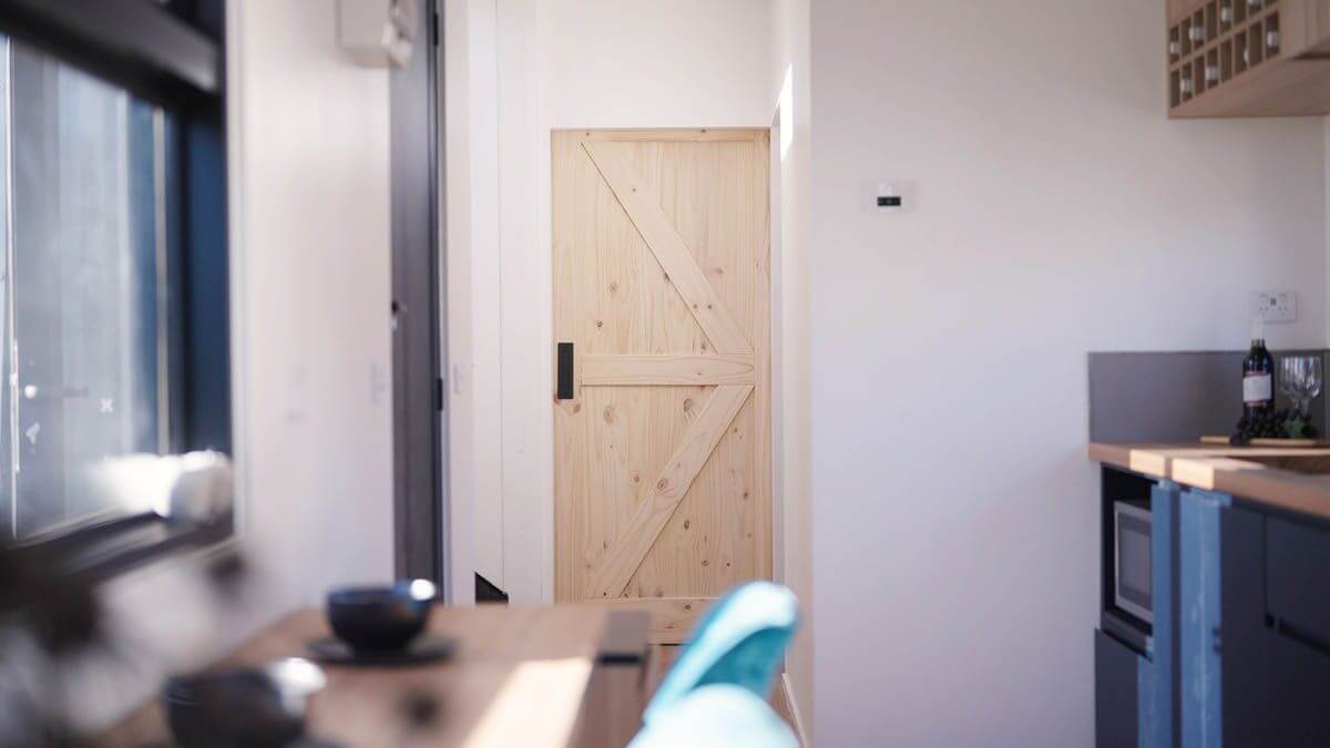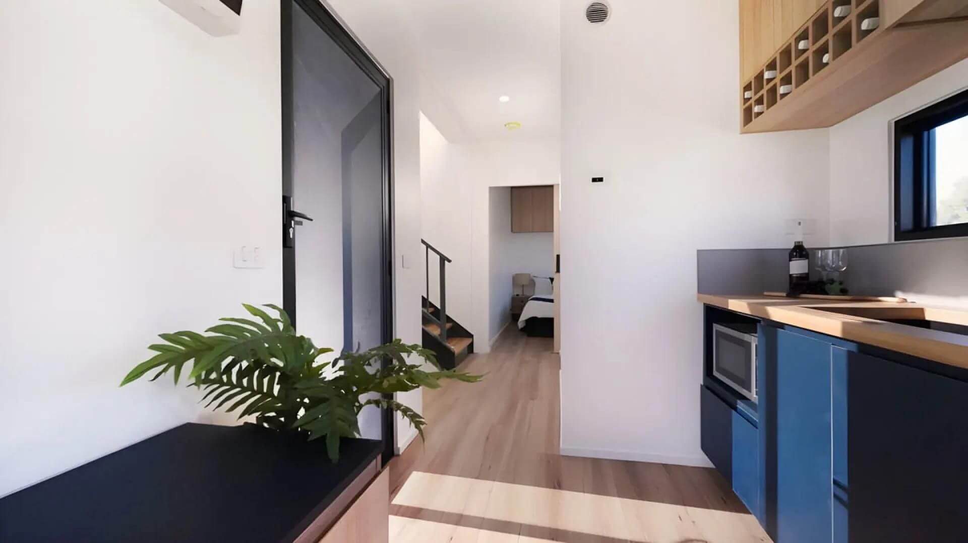 Внутри пространство организовано максимально рационально. На первом этаже расположена кухня, оборудованная современной техникой. Рядом организована небольшая обеденная зона, чуть дальше разместилась гостиная с ТВ-зоной, а также спальня и ванная комната с душем. Второй этаж занимает ещё одна спальня с выходом на две открытые террасы — идеальное место для отдыха на свежем воздухе.