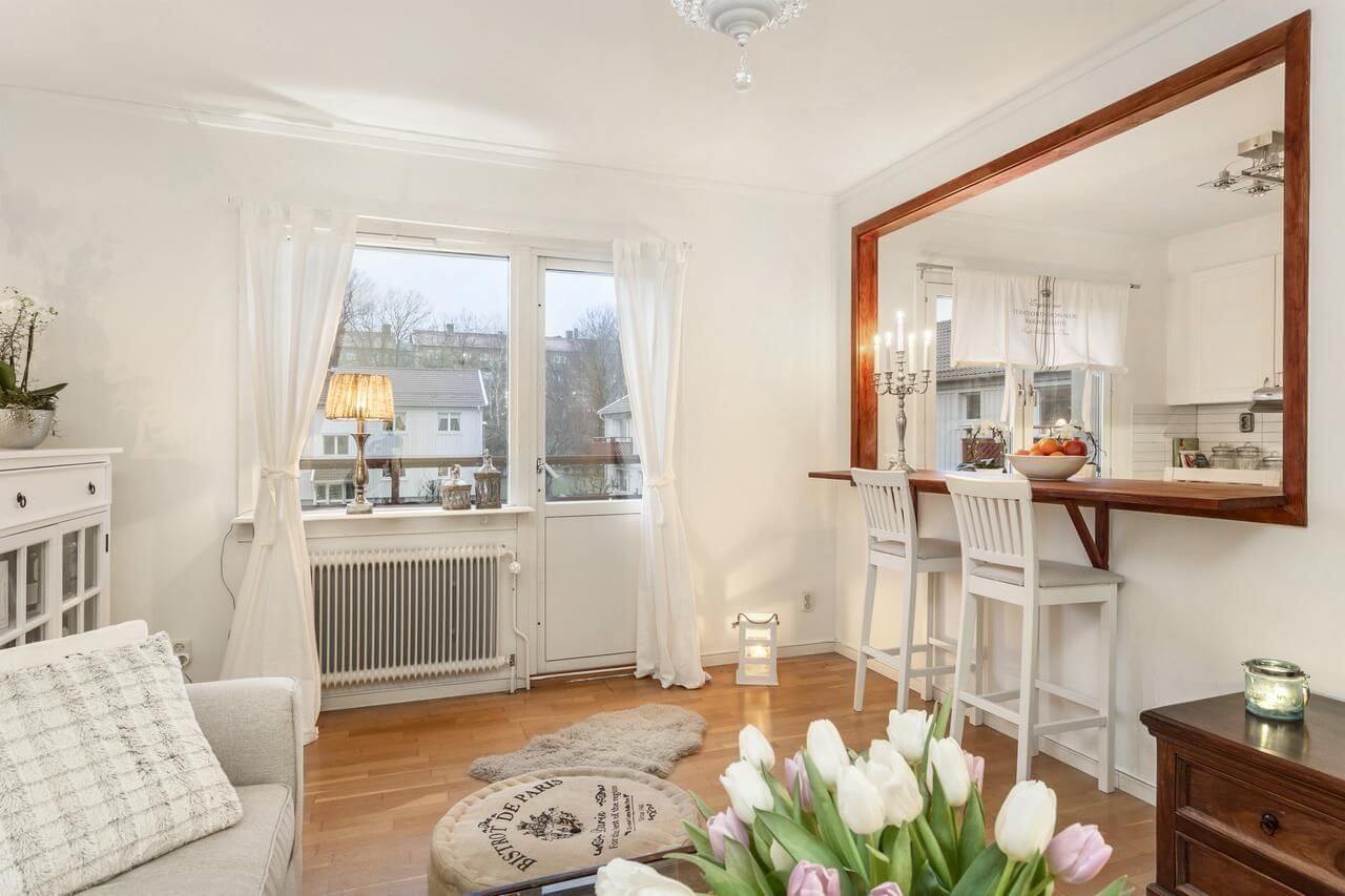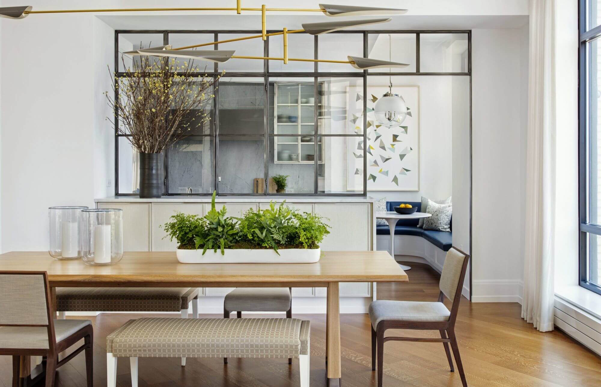 Самый элегантный способ создать видимую границу между кухней и гостиной. Благодаря межкомнатному окну естественный свет свободно проникает из одной зоны в другую, делая интерьер визуально более просторным. Практическая польза также очевидна: через окно удобно подавать готовые блюда и общаться с гостями или семьей. При этом вся посуда остается за пределами зоны видимости.