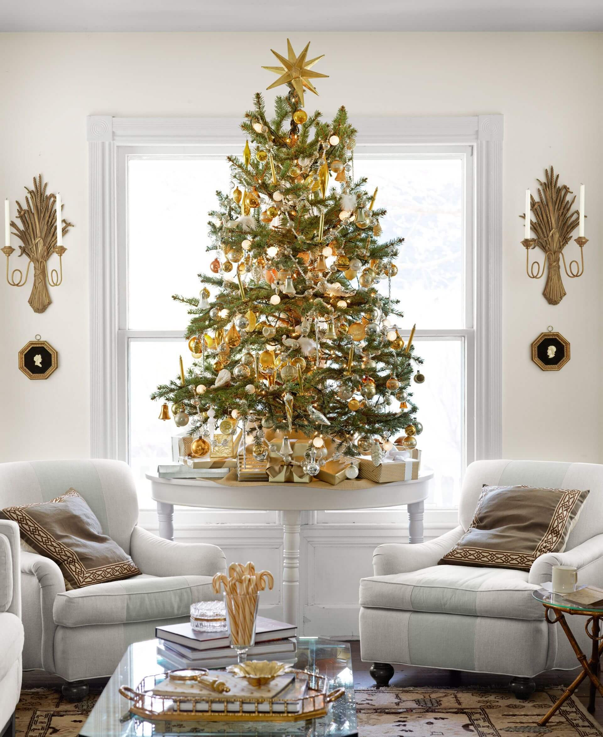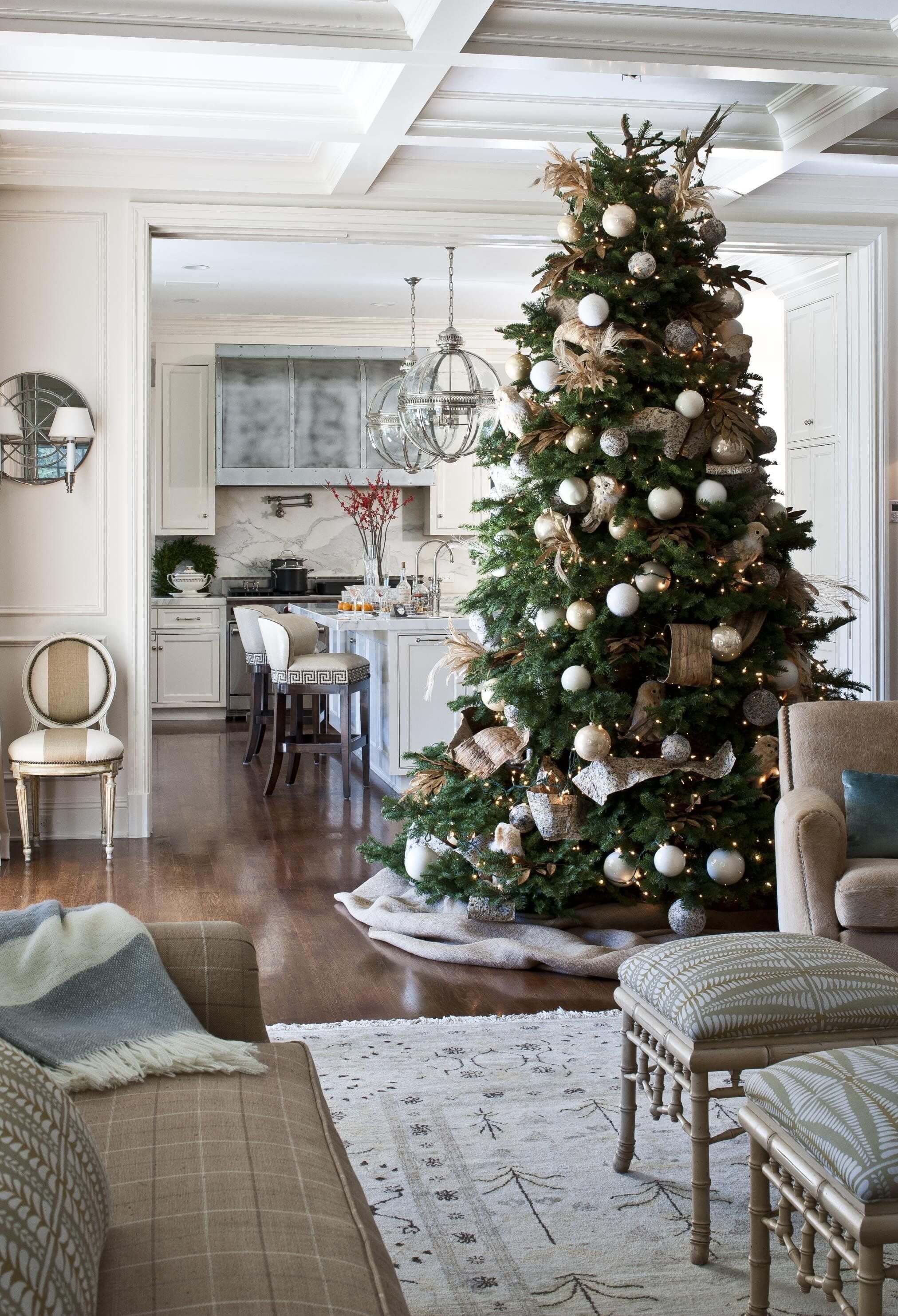 Высокие ёлки становятся главным элементом композиции, вокруг которого строится весь праздничный интерьер. Высота от 2,5 до 4 метров — новый стандарт для просторных гостиных и загородных домов.