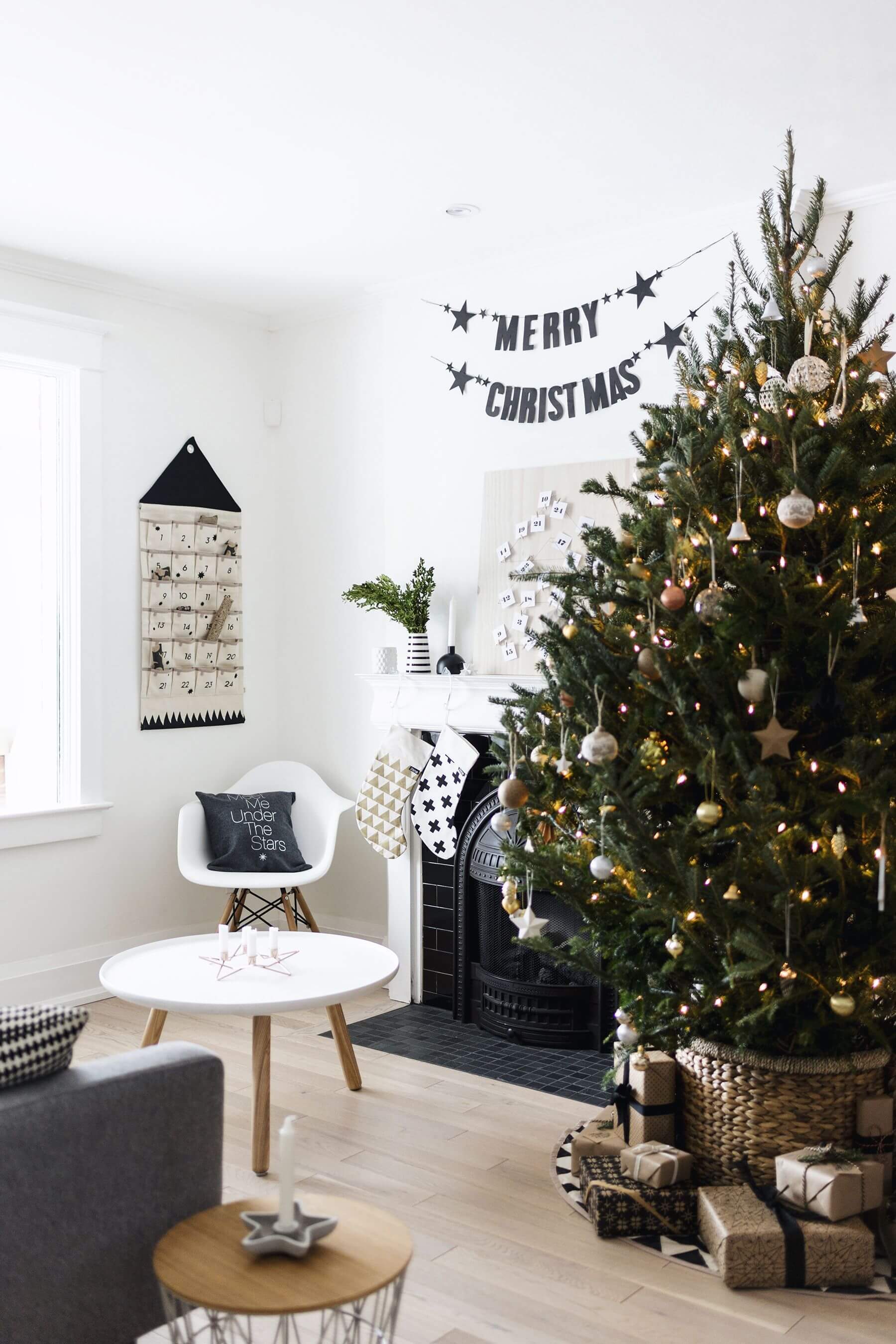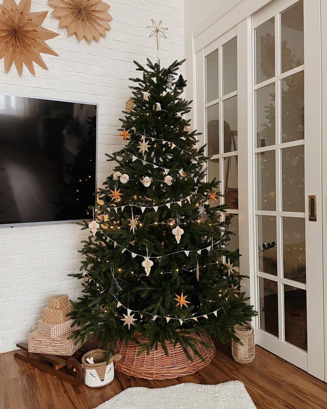 Сканди-декор остаётся одним из самых устойчивых трендов. В центре внимания — простые формы, мягкое освещение и природные оттенки. Ёлки украшают минимальным количеством игрушек, отдавая предпочтение натуральным материалам: дереву, керамике, бумаге. Белый и теплые нейтральные тона доминируют, создавая атмосферу спокойствия и визуальной лёгкости. Такой стиль особенно хорошо работает в современных и светлых интерьерах, подчёркивая архитектуру пространства.