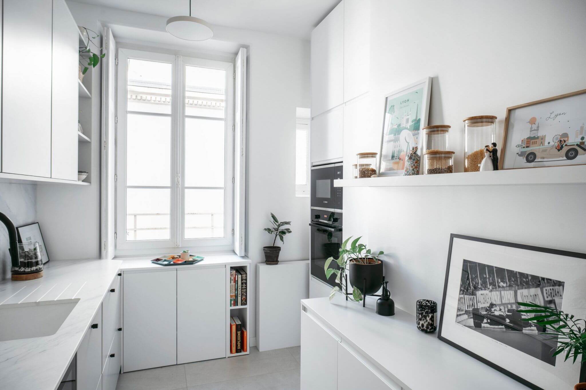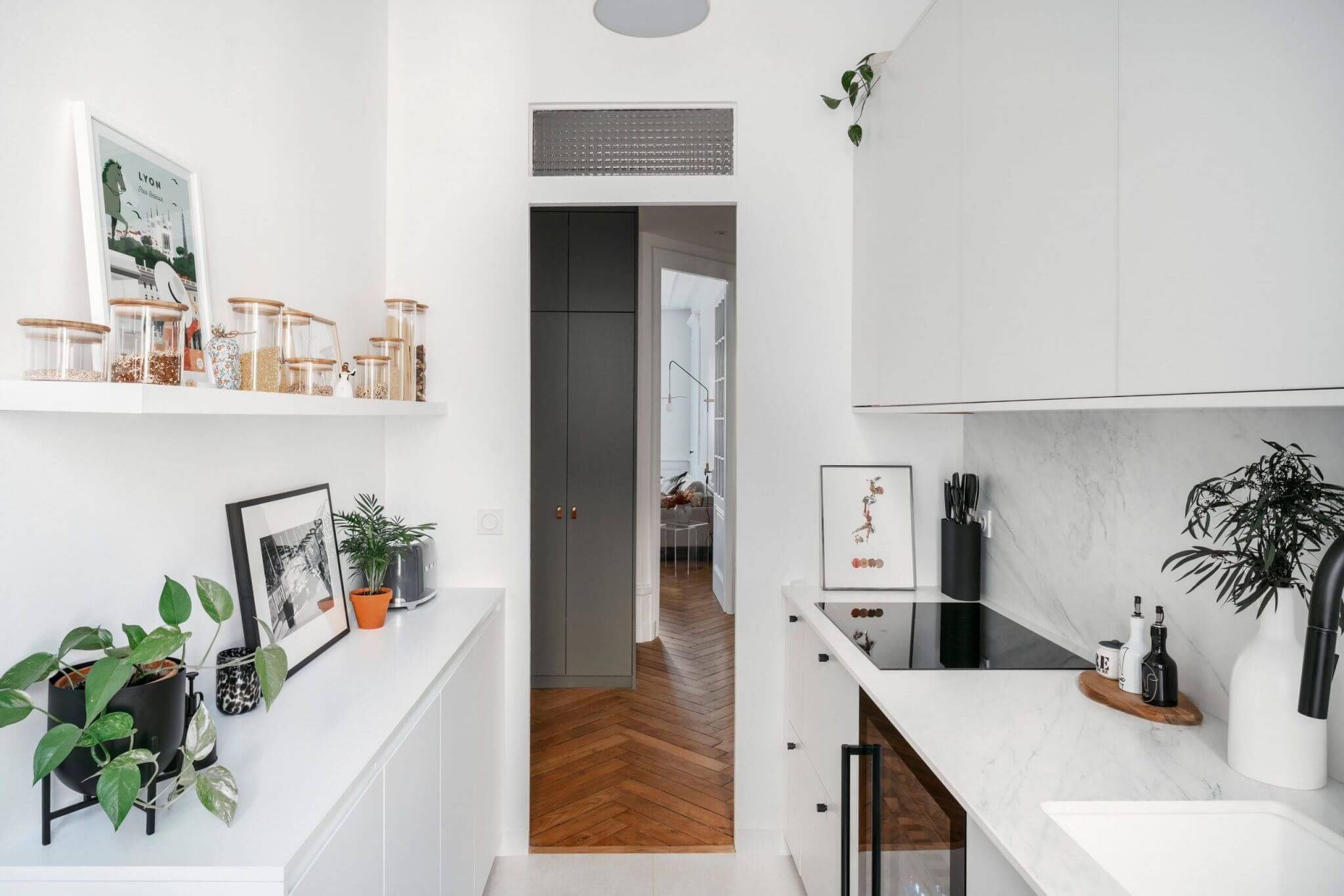 Даже узкая кухня не выбивается из общей концепции. Белоснежные фасады, мраморная столешница, чёрные акценты — всё выглядит стильно, элегантно и при этом легко. Минимализм не в ущерб функциональности: всё продумано до мелочей, от открытых полочек для круп до размещения встроенной техники.