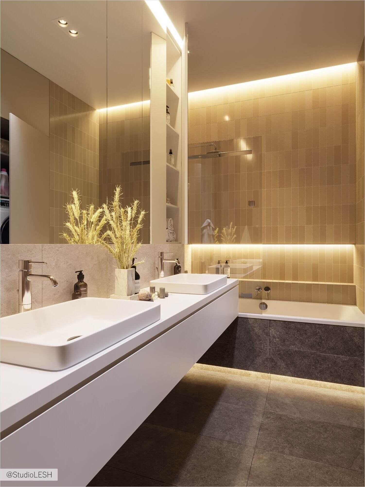 Важную роль в оформлении ванной комнаты играет освещение. Помимо основного света здесь можно сделать светодиодную подсветку зон вокруг тумбочки, зеркал, пола и стен. Теплый мягкий свет поможет создать уютную расслабляющую атмосферу, превращая купание в настоящий спа-ритуал.