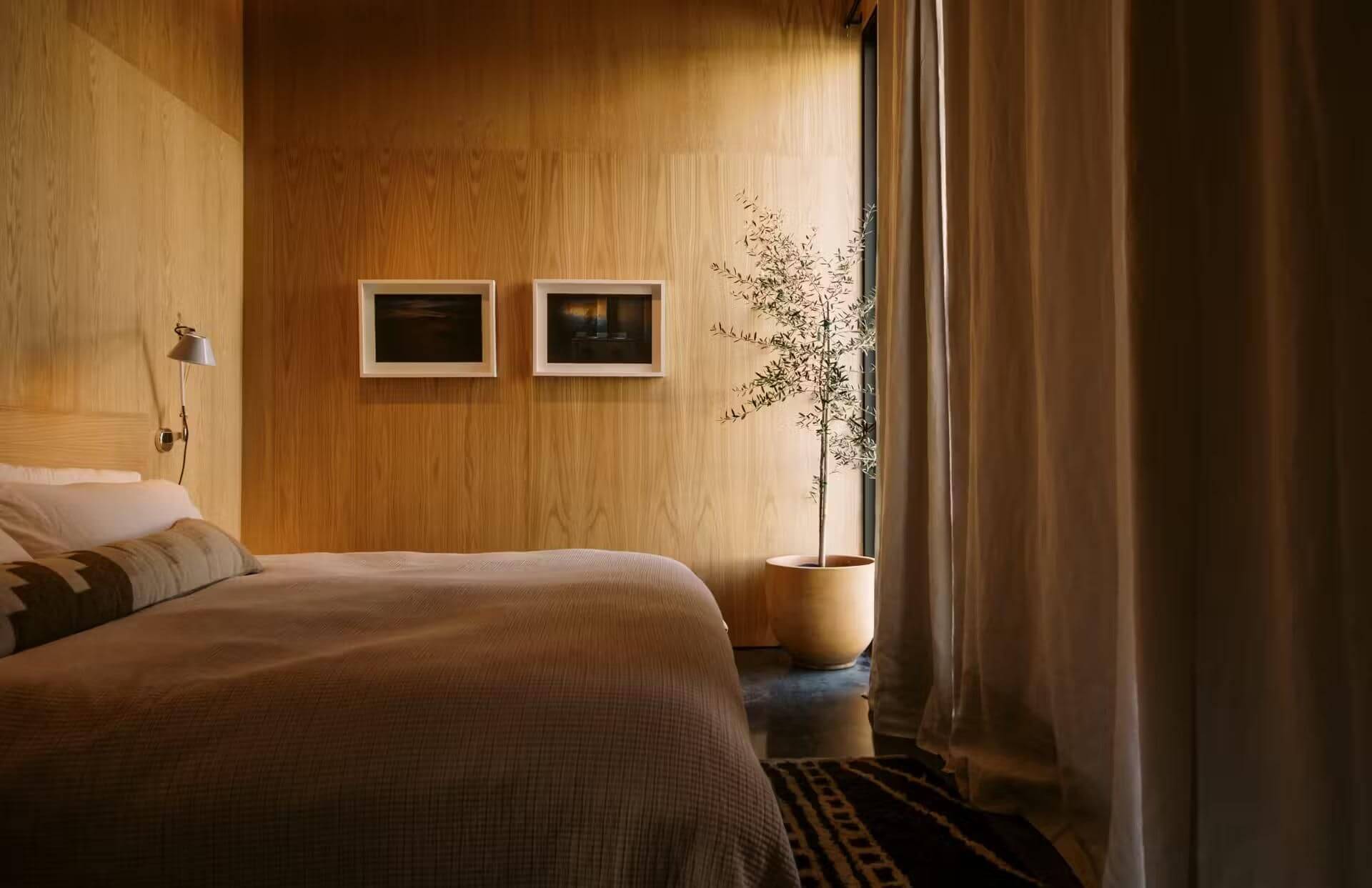 Пространство выполнено в теплых тонах, с использованием натуральных материалов. Панорамное остекление стирает границу между интерьером и окружающим пейзажем. Красивые виды становятся естественным продолжением внутреннего пространства. Здесь сложно сказать, где заканчивается дом и начинается природа — они словно перетекают друг в друга.