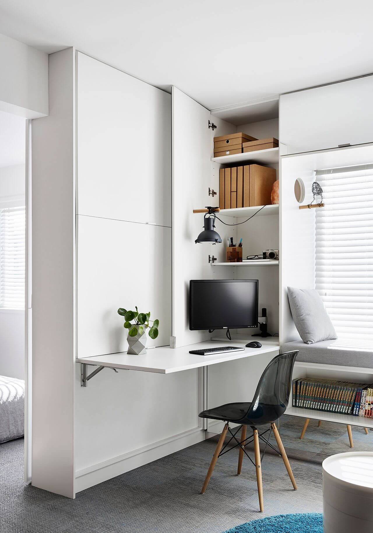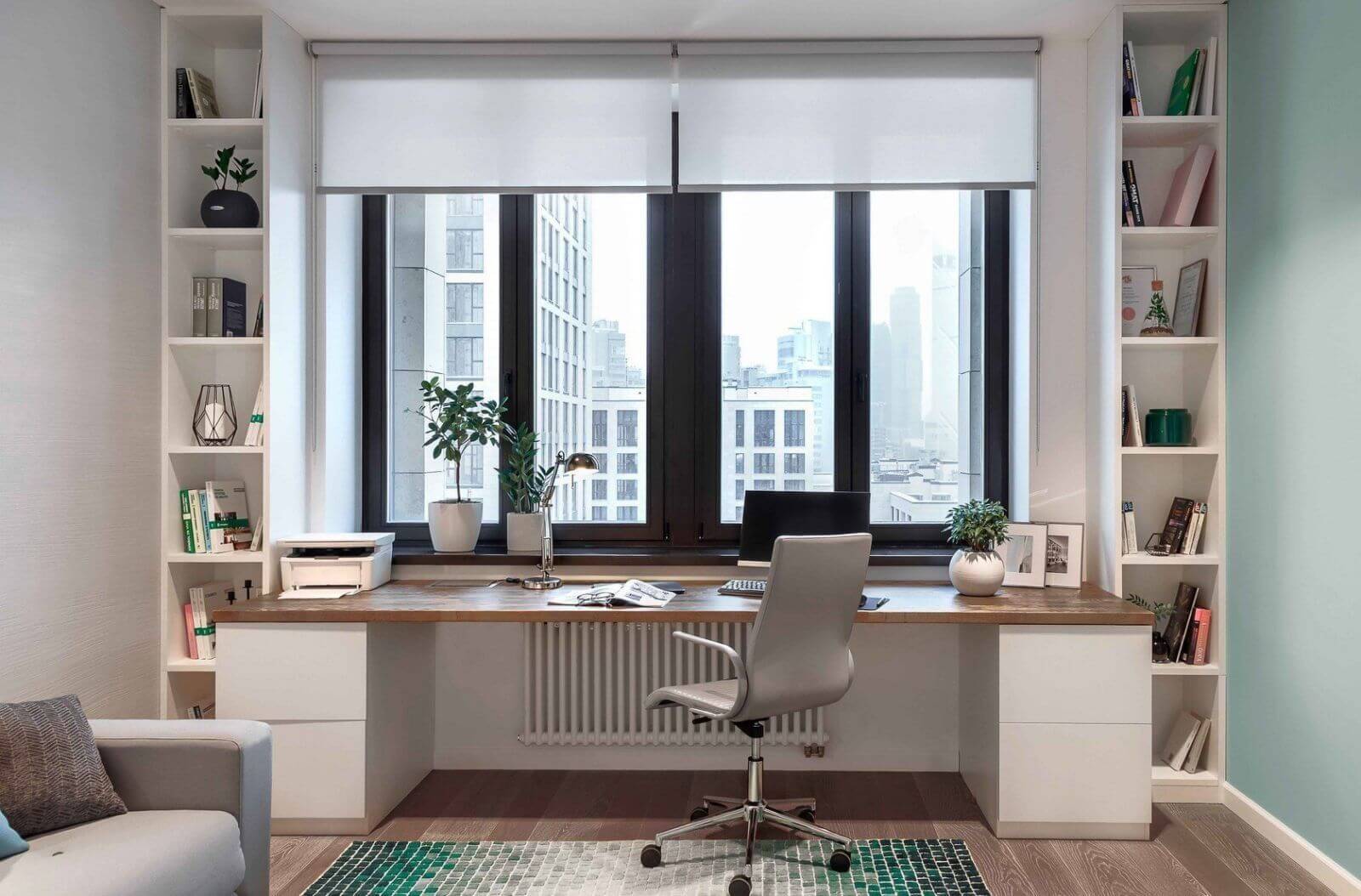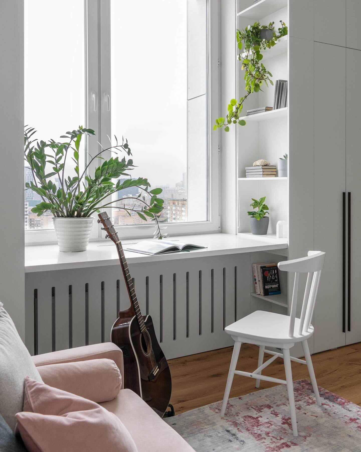 Пространство вокруг окна также часто остаётся пустым и незадействованным, хотя оно обладает большим потенциалом для хранения вещей. Там можно сделать неглубокие полки или стеллажи для книг, декора и других мелких предметов. Сам подоконник легко превратить в зону отдыха или рабочий уголок с небольшими ящиками.