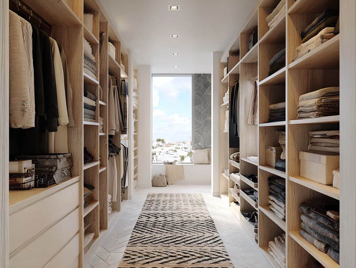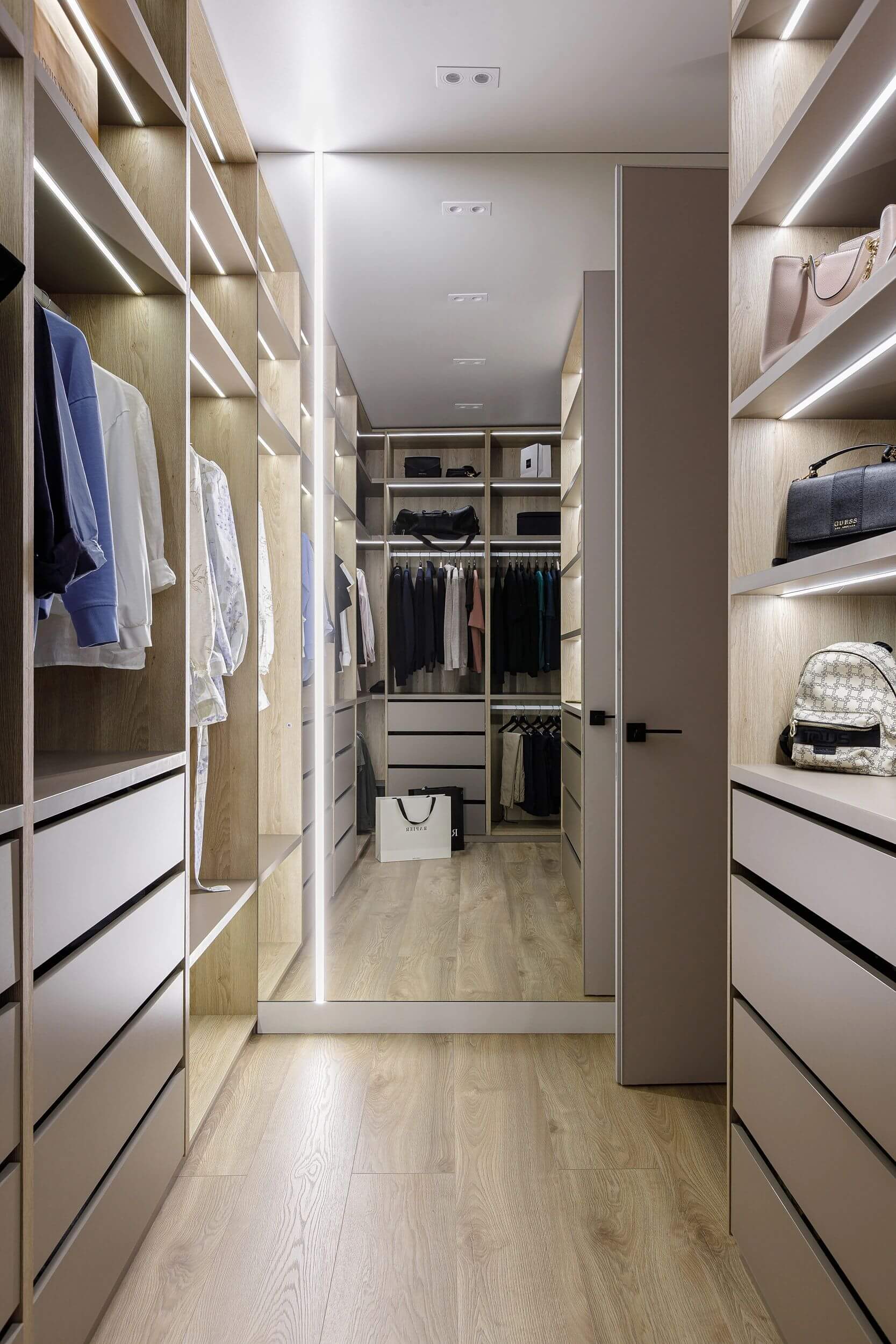 Коридор традиционно считается проходной и не самой функциональной зоной в квартире, но его можно превратить в полноценную гардеробную. Главное — грамотно подойти к планировке и максимально задействовать вертикальное пространство. В длинном и узком коридоре оптимальным решением станут системы хранения, расположенные вдоль одной стены, глубиной не более 60 см. Если позволяет ширина, можно разместить П-образную конструкцию. Для хранения футболок и рубашек используйте штанги, расположенные друг над другом на расстоянии 80–100 см. Штангу для длинных пуховиков или платьев лучше вешать на высоте 170–180 см от пола. Также не забудьте про крючки для сумок и ремней, корзины для аксессуаров, узкие полки для обуви и мелких вещей. Обязательно выделите зону для примерки с пуфиком и зеркалом во весь рост, которое можно разместить на торцевой стене или входной двери.
